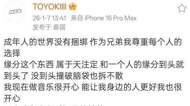 TOYOKI也公开发声,给出一份真挚的回应。 “缘分这个东西属于天注定,和一个人的缘分到头就到头了,没到头撞破脑袋也拆不散,至少我们有段时间是纯粹的”