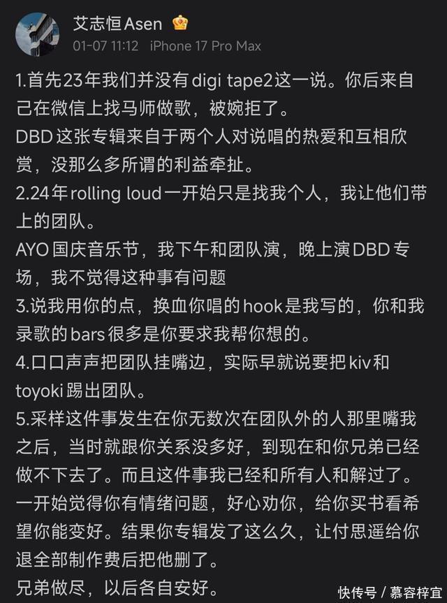 众所周知,ASEN已经回应了SAKEE。 “一开始觉得你有情绪问题,好心劝你,给你买书看希望你能变好。结果你专辑发了这么久,让付思遥给你退全部制作费后把他删了。兄弟做尽,以后各自安好”