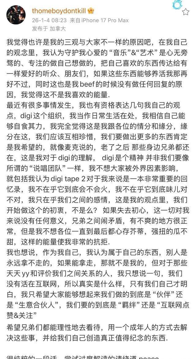 但在THOME之前的发文里,他希望兄弟们都能珍惜来之不易的感情。