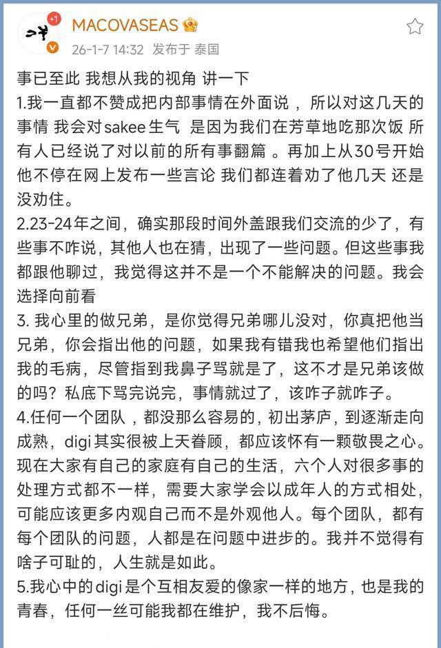 同时,DIGI多位成员纷纷发声。 大哥MACOVASEAS发文,谈到SAKEE事件。 MAC表示,之前芳草地吃饭大家对以前的所有事翻篇了,但SAKEE还是一直发,兄弟们劝不住。 MAC还透露,这两年ASEN和大家交流的少了,有些事不会和大家说,从而出现了问题。